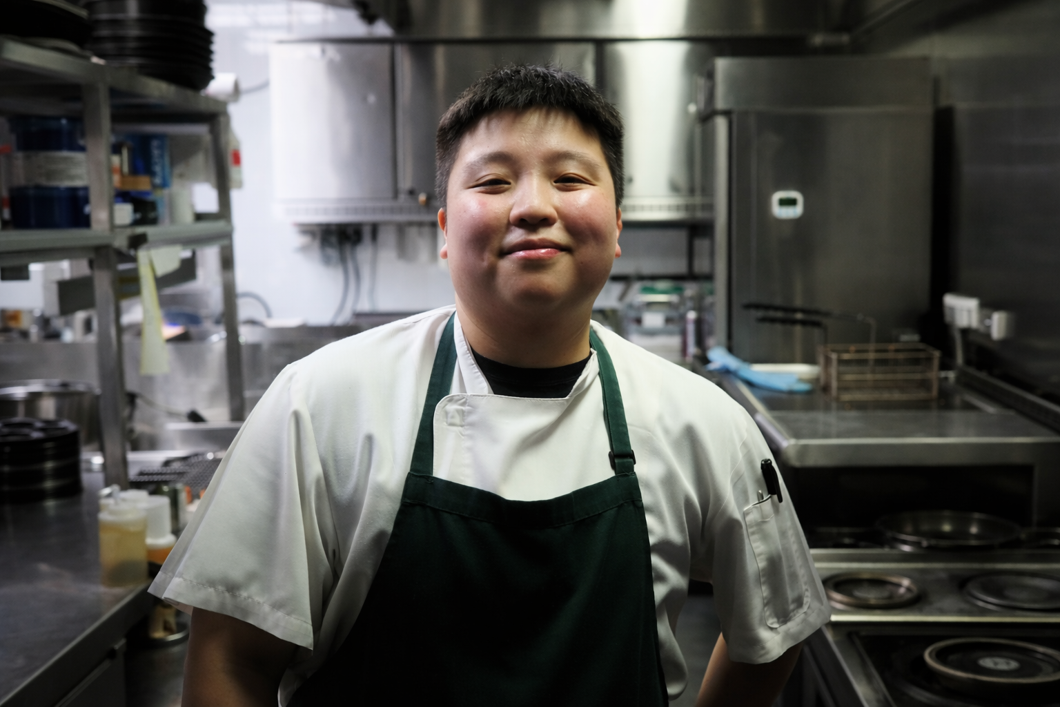 Su chuleta de cerdo char siu al horno de leña, con un precio de 36 SGD++, se sirve con pepino encurtido machacado, cebolla y patatas pequeñas. Inspirado en su trayectoria como chef singapurense, el plato combina sabores locales y cocina auténtica, equilibrando la tradición con una tranquila confianza.